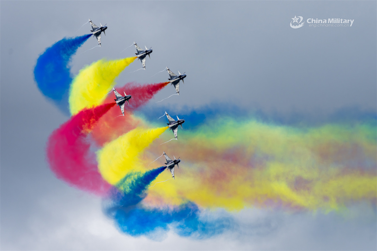 J-10 multi-role fighter jets attached to the Bayi Aerobatic Team of the Chinese PLA Air Force perform aerobatic stunts in formation during an adaptive training on September 18, 2025. The aviation open-day activities of the Chinese People’s Liberation Army Air Force (PLAAF) and the Changchun Air Show 2025 will be held from September 19 to 23 in Changchun City, northeast China’s Jilin Province. All the preparations for the event have been completed. (eng.chinamil.com.cn/Photo by Yang Pan)
