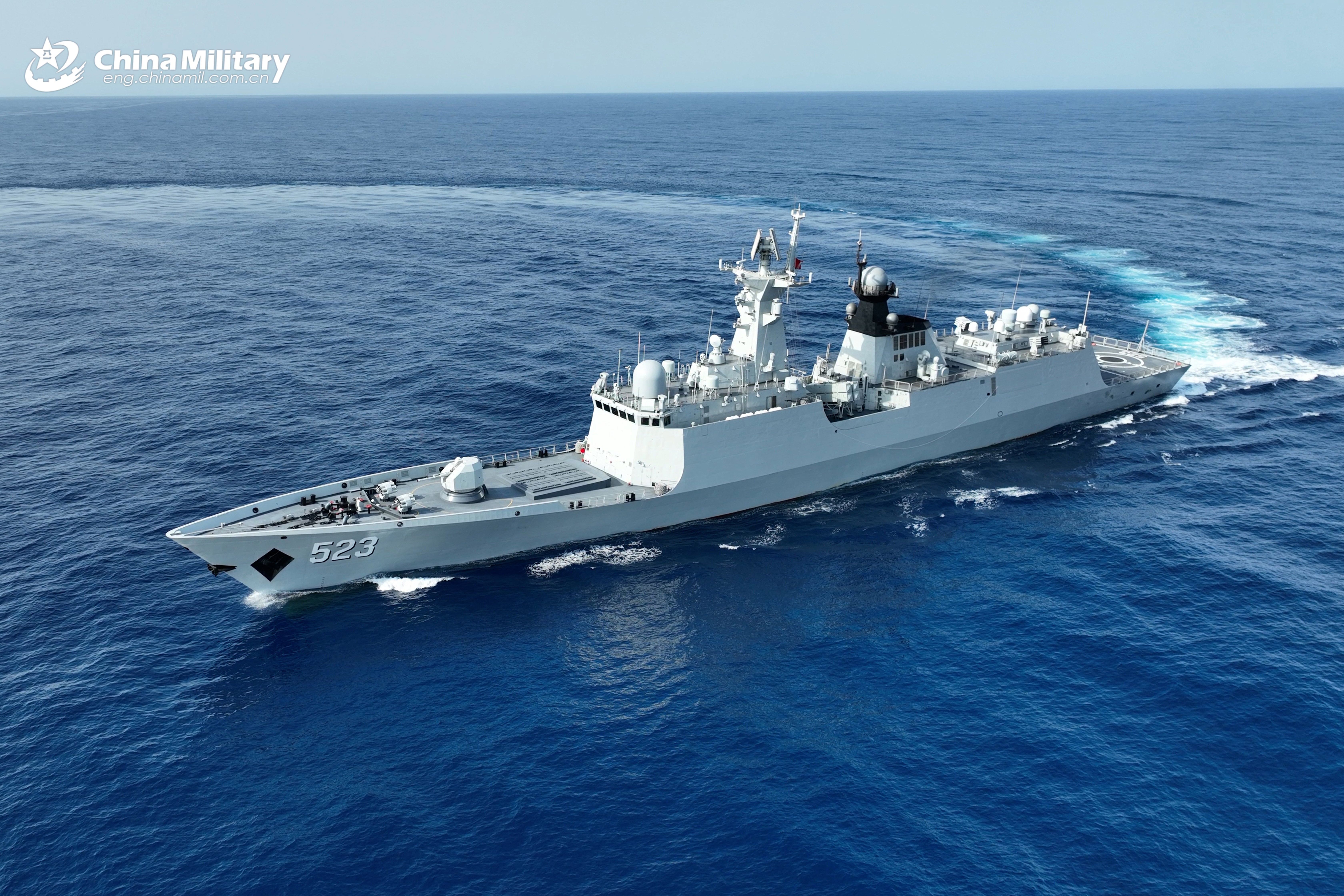 Guided-missile frigate Honghe (Hull 523) attached to the 47th Chinese naval escort taskforce maneuvers at sea during a recent multi-subject training exercise in the Gulf of Aden. (eng.chinamil.com.cn/Photo by Li Zhengcao) 近日,海軍第47批護(hù)航編隊(duì)在亞丁灣海域利用護(hù)航間隙,展開(kāi)主副炮對(duì)海射擊、艦載直升機(jī)飛行等多課目訓(xùn)練,檢驗(yàn)實(shí)戰(zhàn)化水平,錘煉官兵打贏本領(lǐng)。(英文中國(guó)軍網(wǎng)/李政操 攝)