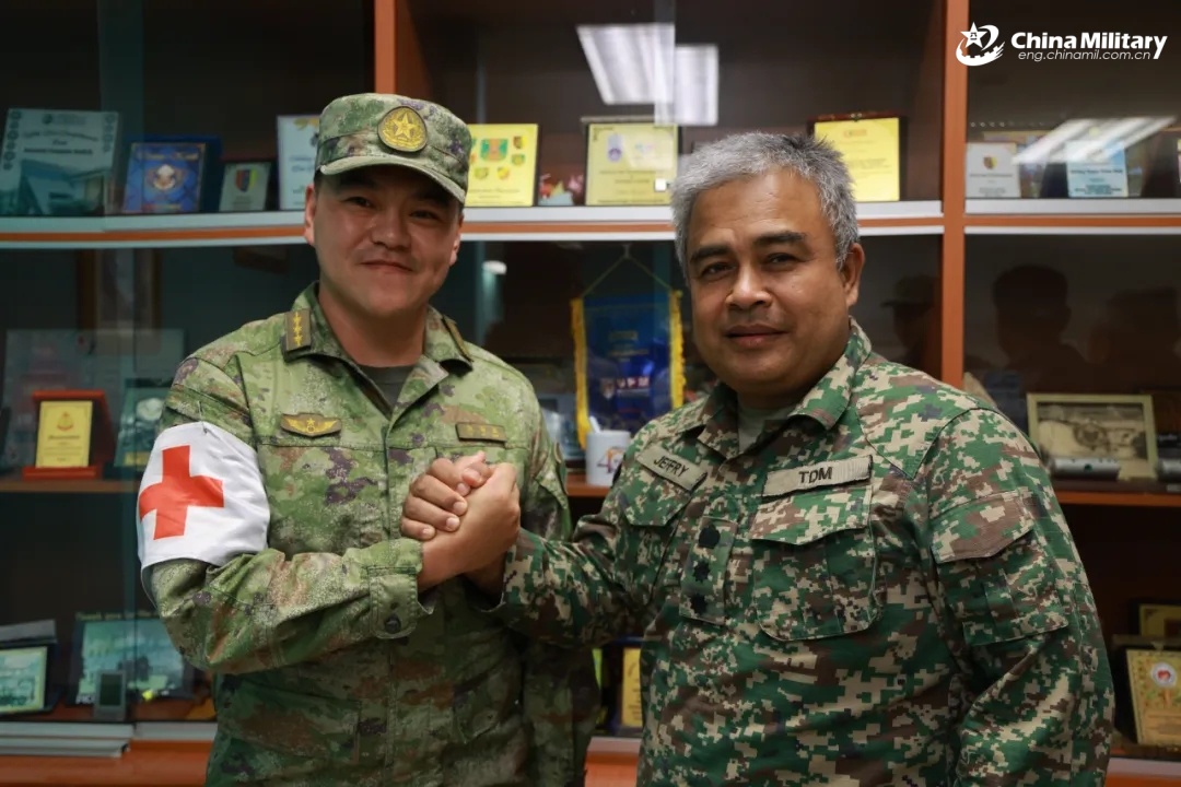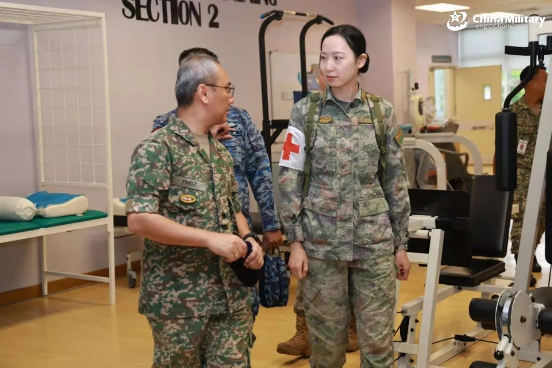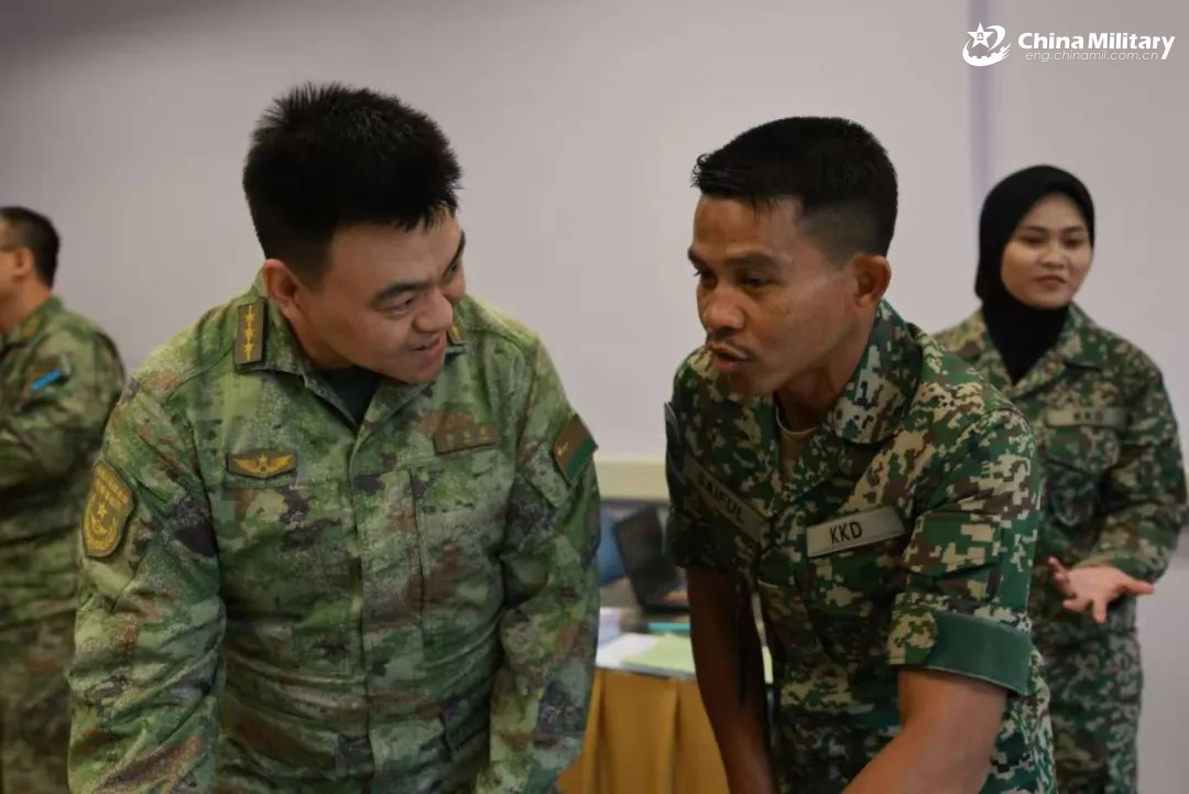 Chinese and Malaysian service members communicate with each other during the Chinese medical and epidemic prevention team's visit to Tuanku Mizan Military Hospital in Malaysia on October 16, 2025.