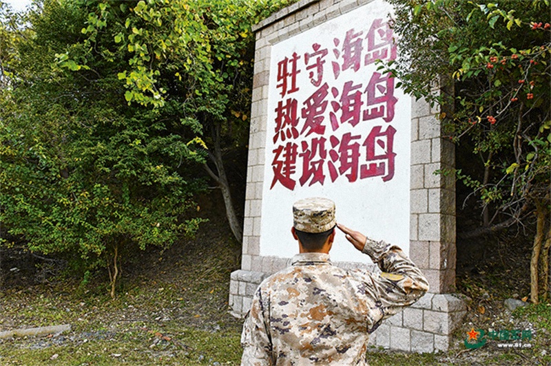 進島的碼頭旁,矗立著一座2米多高的青色石碑,那是老一輩守島官兵建起來的,上面刻著“駐守海島、熱愛海島、建設海島”12個朱紅大字。