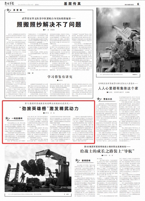 “勁旅英雄榜”是該旅探索的群眾性練兵比武新形式。前期,旅領導在基層蹲點調研時發(fā)現(xiàn),不少單位樓前櫥窗內的“龍虎榜”更新較慢,而且長時間位居榜首的基本都是“老面孔”。