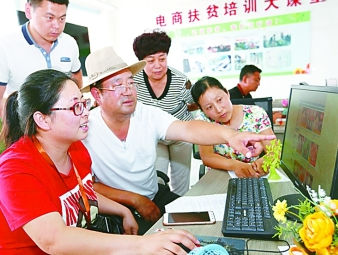 山東青島市即墨區(qū)移風(fēng)店鎮(zhèn)電商培訓(xùn)中心的工作人員在指導(dǎo)貧困戶通過網(wǎng)絡(luò)銷售農(nóng)產(chǎn)品。新華社發(fā)