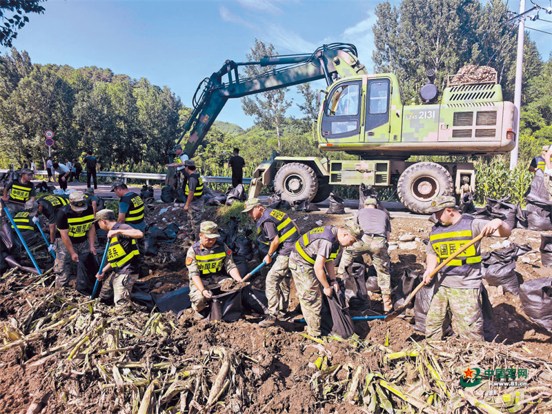 七月二十九日,河北省灤平縣人武部組織民兵在馬營子滿族鄉(xiāng)王北溝門大橋附近轉(zhuǎn)運沙袋,加固堤壩。譚一村 攝