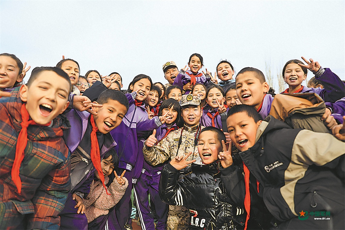 元旦前夕,武警新疆總隊(duì)某支隊(duì)官兵來(lái)到阿克塔什村小學(xué),與學(xué)生交流互動(dòng)。孫孟鑫攝
