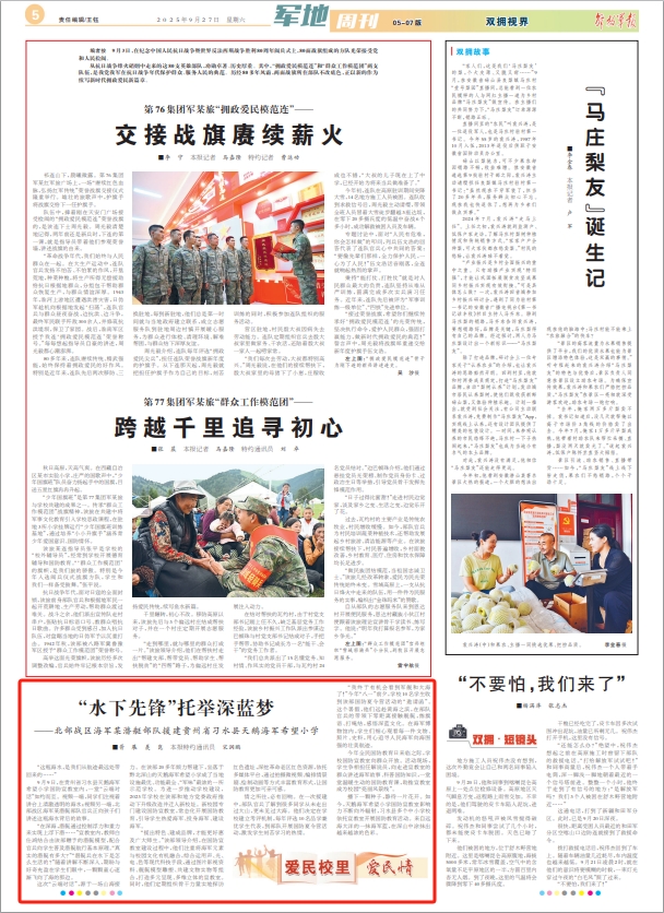 這次“云端對話”,源于一場山海接力。在該部20多年傾力幫建下,坐落于黔北深山的天鵝海軍希望小學(xué)成了當(dāng)?shù)卦O(shè)施最優(yōu)、功能最全、“軍味”最濃的一所示范學(xué)校。為進一步推動學(xué)校建設(shè),2023年學(xué)校在該部和地方黨委政府推動下升級改造并遷入新校址。新校園專門建設(shè)國防宣教室,常態(tài)化開展國防教育,引導(dǎo)學(xué)生熱愛海軍、投身海軍、建設(shè)海軍。