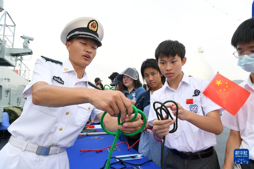 9月30日,參加艦艇開放活動的香港學(xué)生在戚繼光艦上學(xué)習(xí)打繩結(jié)。新華社記者 陳鐸 攝