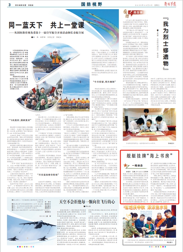 除了展覽,北部戰(zhàn)區(qū)海軍還攜手國家圖書館發(fā)起“海上書房”共建活動。9月19日,海軍遼寧艦、南昌艦、“吉祥方舟”號醫(yī)院船等6艘艦艇掛牌“海上書房”,國家圖書館為艦艇官兵贈送3600冊優(yōu)質圖書,涵蓋軍事理論、社會科學、歷史文化等多個領域,讓官兵在戰(zhàn)備訓練之余,享受精神食糧。同時,雙方建立長效合作機制,國家圖書館每年定期為“海上書房”更新2000冊新書。