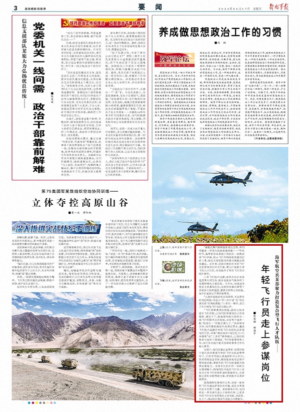 “根據(jù)近期氣象數(shù)據(jù)和海區(qū)態(tài)勢,我們需要進一步優(yōu)化航線規(guī)避預案……”仲秋時節(jié),海軍航空兵某部計劃組織一場跨晝夜飛行訓練,剛從飛行員轉崗到參謀崗位的小李,結合自身經(jīng)驗對訓練方案提出修改建議。近年來,該部分批組織年輕飛行員到參謀崗位淬火歷練,聚力打造復合型飛行人才隊伍,有效提升了年輕飛行員的綜合素質。