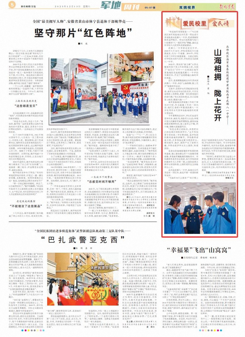 走進(jìn)由該基地援建的學(xué)校國防教育基地,墻上懸掛著全軍十大掛像英模畫像,多型海軍艦艇模型展陳其中。學(xué)校教師李條芳告訴筆者,如今學(xué)校將國防教育作為入學(xué)第一課,以國防故事點(diǎn)燃學(xué)生報(bào)國熱情,讓擁軍愛軍信念深植師生心中。