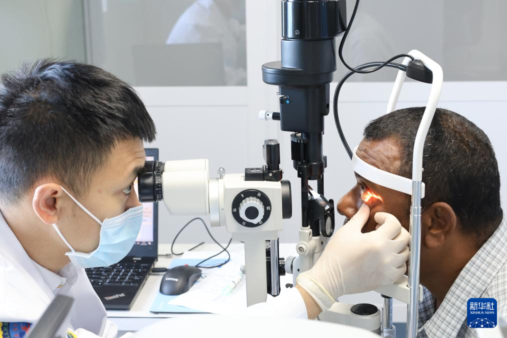 9月23日,中國(guó)海軍“絲路方舟”號(hào)醫(yī)院船醫(yī)護(hù)人員在瑙魯為當(dāng)?shù)孛癖娺M(jìn)行眼科檢查。新華社發(fā)(崔曉洋攝)