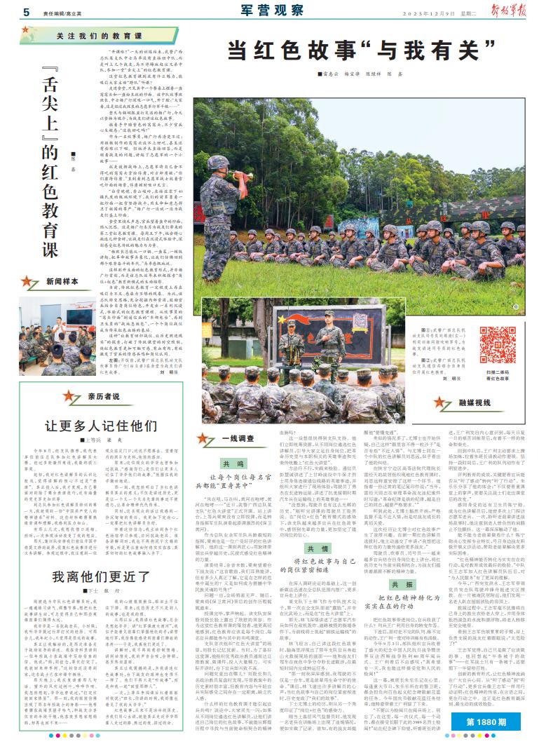 真正讓我震撼的是,當(dāng)我講述紅色故事時(shí),臺(tái)下戰(zhàn)友的眼神也變得不一樣了。他們不再只是“聽(tīng)故事”,而是和我一起“回望那群人”。