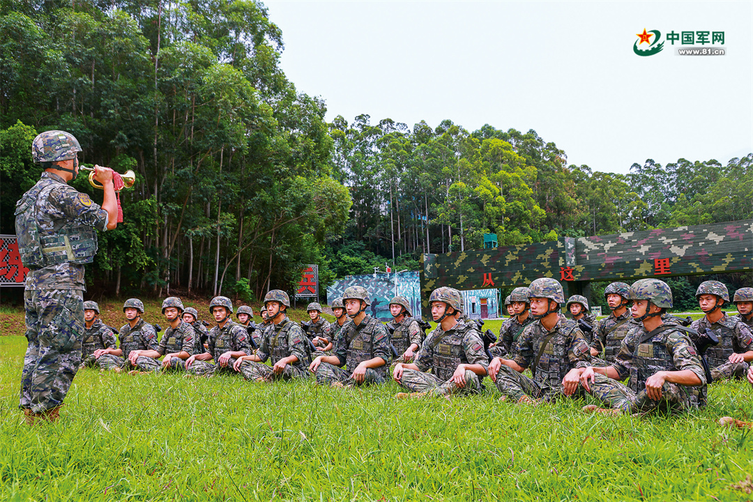 武警廣西總隊(duì)機(jī)動(dòng)支隊(duì)司號(hào)員劉順波(左一)利用訓(xùn)練間隙吹響軍號(hào),為戰(zhàn)友講述司號(hào)員的紅色故事。劉明 攝