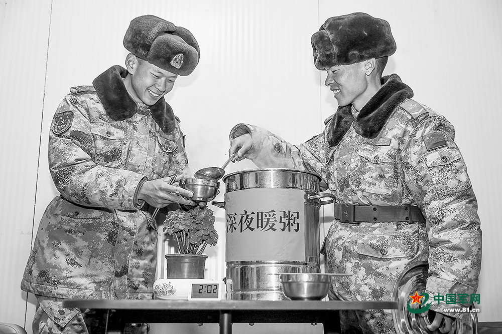 深夜,某連2名戰(zhàn)士完成搶修任務歸來。凍得渾身發(fā)抖的他們,看到學習室里亮著燈的保溫桶,臉上立刻露出笑容。“有了它,再晚回來心里都踏實?!币患壣鲜课航瘕堖呎f邊盛出2碗熱氣騰騰的粥。