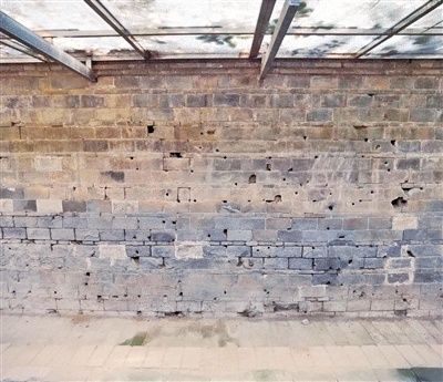 宋莊戰(zhàn)斗遺址內(nèi)一面布滿彈孔的墻壁。資料照片
