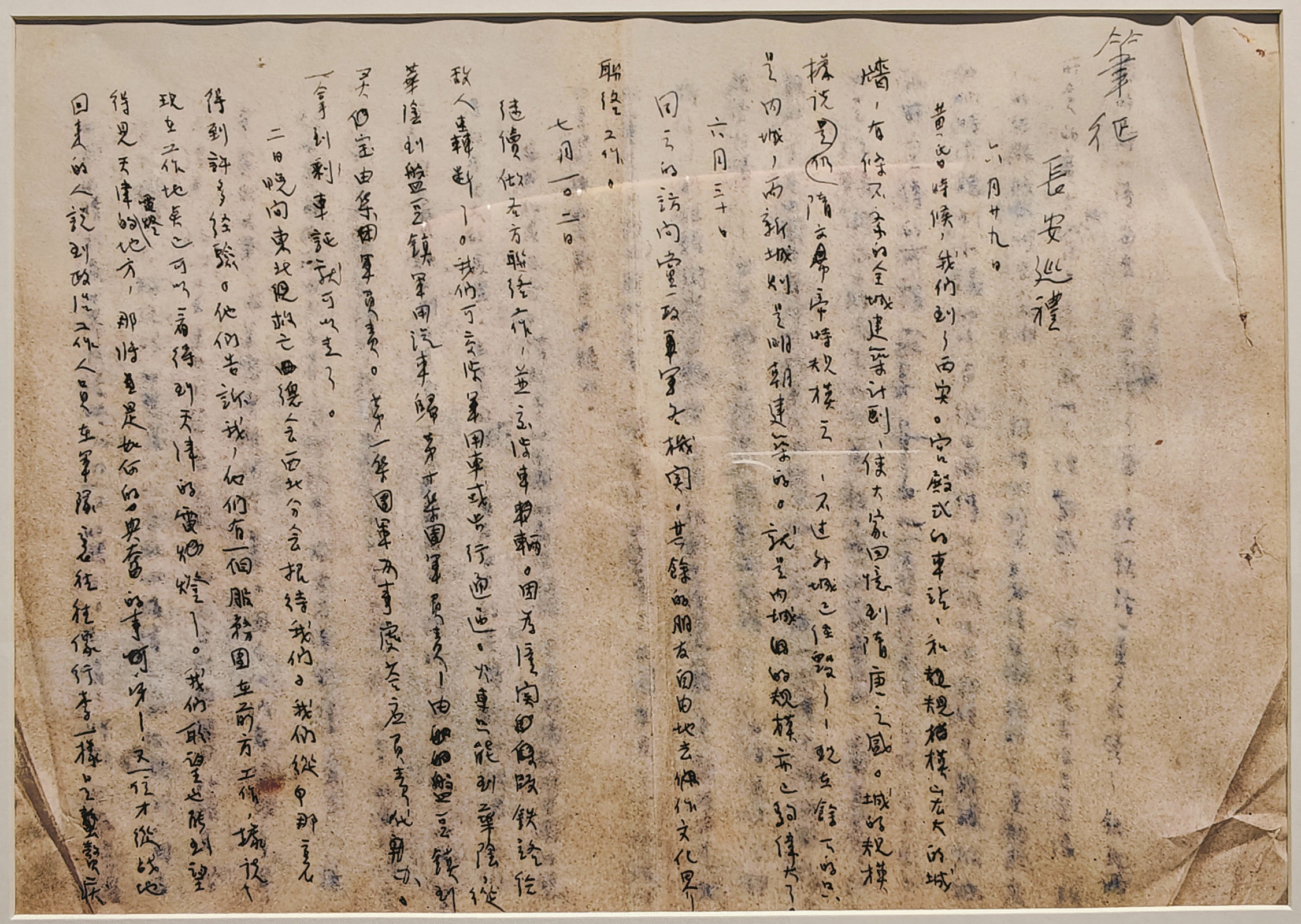 1938年3月27日,中華全國(guó)文藝界抗敵協(xié)會(huì)在漢口總商會(huì)禮堂正式成立,提出“文章下鄉(xiāng),文章入伍”的口號(hào),鼓勵(lì)文藝工作者深入農(nóng)村、深入戰(zhàn)地前線去“戰(zhàn)斗”。愛(ài)國(guó)詩(shī)人王禮錫率領(lǐng)的作家戰(zhàn)地訪問(wèn)團(tuán)成為響應(yīng)口號(hào)的文化團(tuán)體之一。該團(tuán)于1939年6月18日出發(fā),深入晉、冀、豫、陜等地,在民眾中走訪,用詩(shī)歌、小說(shuō)、戲劇、散文、圖畫(huà)等形式將敵后軍民可歌可泣的英雄事跡呈現(xiàn)出來(lái)。王禮錫不僅參與訪問(wèn)團(tuán)寫(xiě)集體日記的任務(wù),還堅(jiān)持寫(xiě)個(gè)人日記?,F(xiàn)存的27篇日記,具體生動(dòng)地記錄了他戰(zhàn)地征途的所見(jiàn)所聞,留下了珍貴的抗戰(zhàn)史料。2024年,《筆征日記》被評(píng)為國(guó)家一級(jí)文物。(王艾濤攝于中國(guó)現(xiàn)代文學(xué)館)