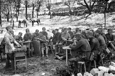 1939年12月,國(guó)民黨反動(dòng)派軍隊(duì)進(jìn)犯陜甘寧邊區(qū),八路軍359旅旅長(zhǎng)王震(左側(cè)站立者)召集干部會(huì)議,動(dòng)員部署保衛(wèi)黨中央。