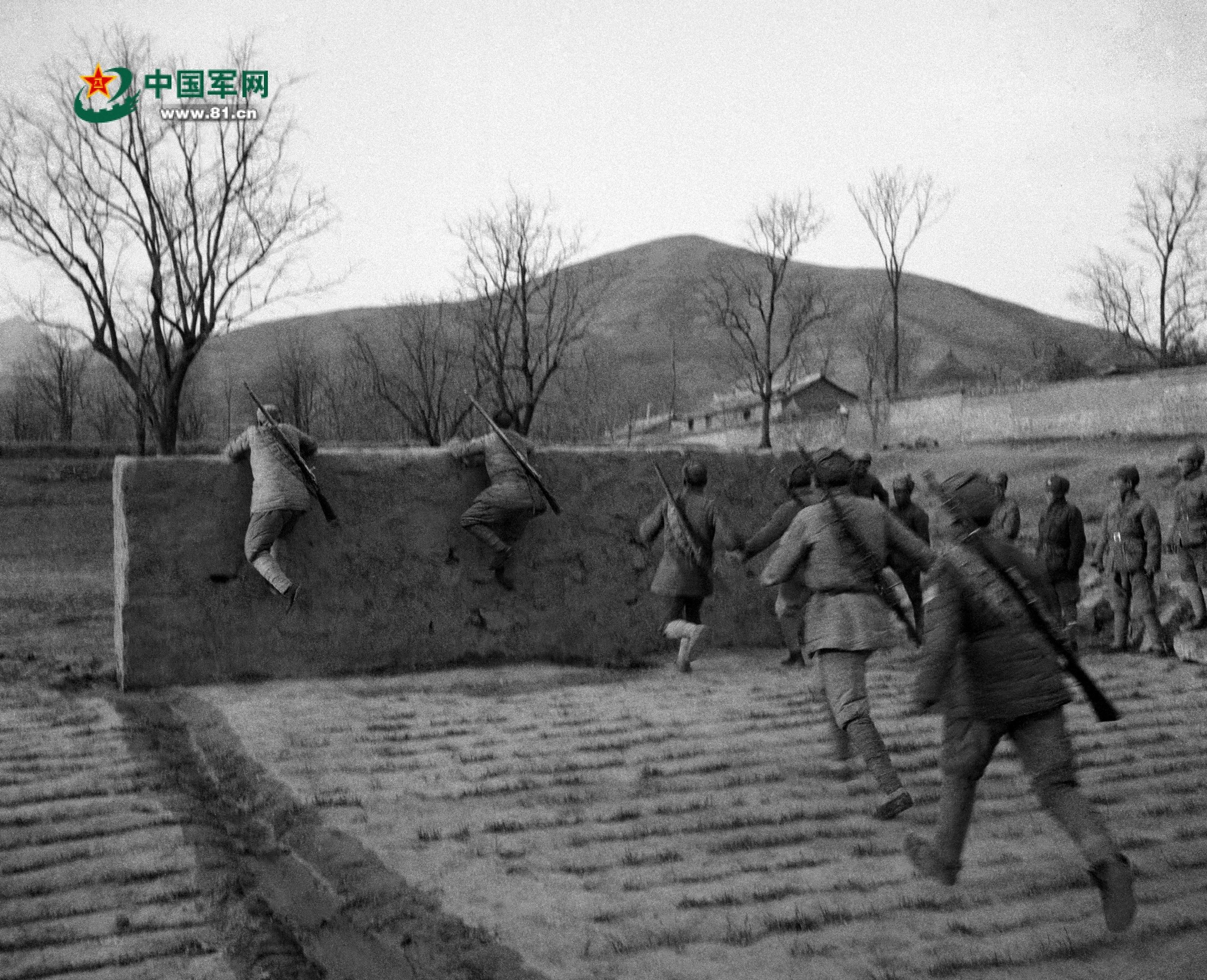 八路軍晉察冀某部開展翻越障礙訓練。