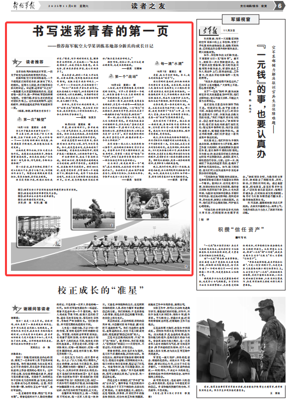 在海軍航空大學(xué)某訓(xùn)練基地,一個(gè)個(gè)摸爬滾打的年輕身影,漸漸有了軍人的模樣。征得本人同意,我們推薦部分新兵的日記。日記里,記錄著“兵之初”一張張面孔從青澀到剛毅的改變,見證著每一滴汗水、每一聲吶喊背后的拼搏與堅(jiān)持。字里行間,青春與迷彩的真誠(chéng)對(duì)話躍然紙上。這些成長(zhǎng)的細(xì)節(jié)、記憶的碎片,拼接出追光逐夢(mèng)的軍旅篇章第一頁(yè)。