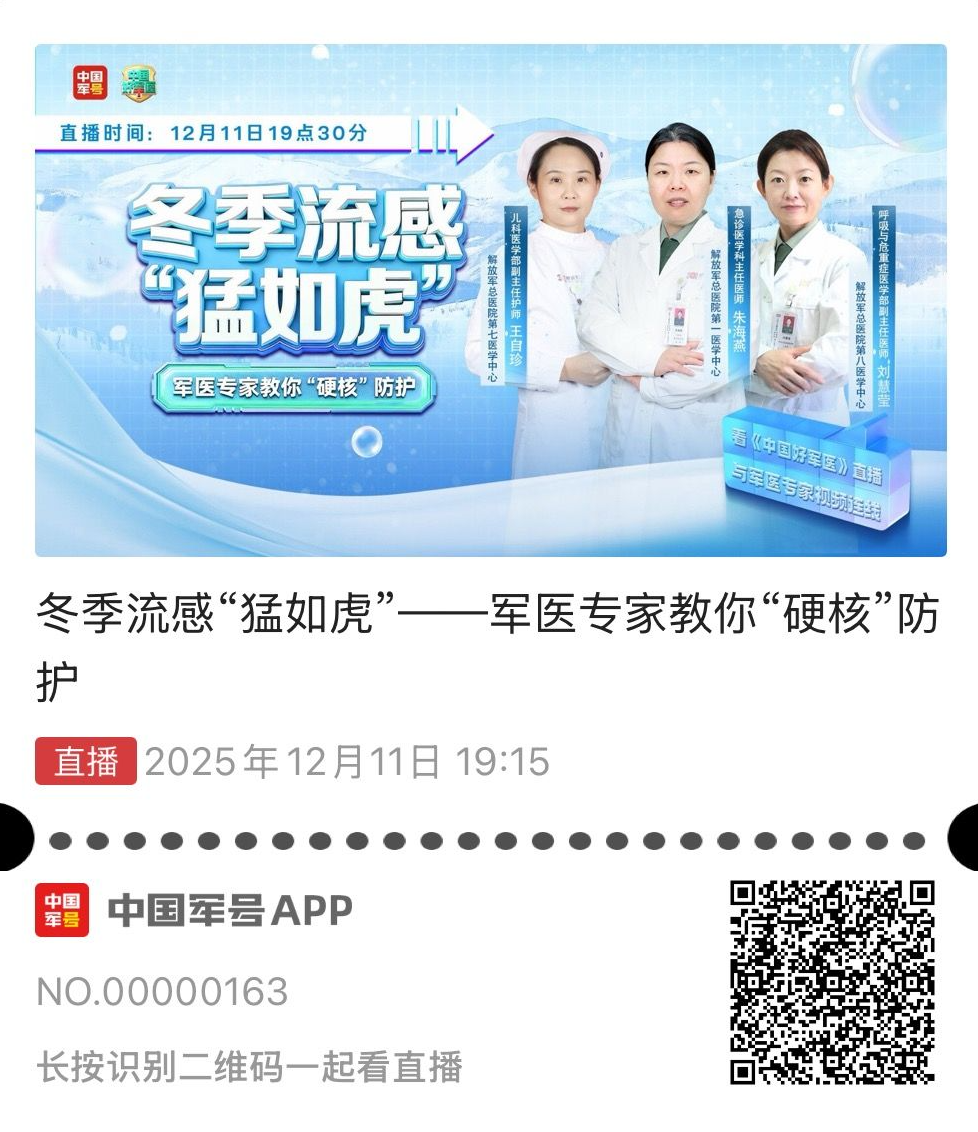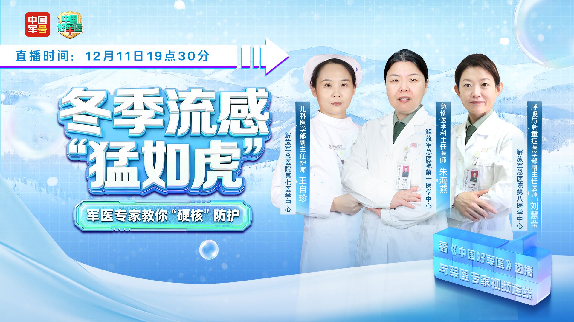 冬季流感來(lái)勢(shì)洶洶!鼻塞、咳嗽、肺炎、反復(fù)發(fā)燒怎么辦?流感和普通感冒如何區(qū)分?哪些是必須警惕的流感重癥信號(hào)?……12月11日晚19:30,中國(guó)軍號(hào)《中國(guó)好軍醫(yī)》直播間將邀請(qǐng)解放軍總醫(yī)院專(zhuān)家團(tuán)隊(duì):第一醫(yī)學(xué)中心急診醫(yī)學(xué)科主任醫(yī)師朱海燕、第七醫(yī)學(xué)中心兒科醫(yī)學(xué)部副主任護(hù)師王自珍、第八醫(yī)學(xué)中心呼吸與危重癥醫(yī)學(xué)部副主任醫(yī)師劉慧瑩三位權(quán)威專(zhuān)家,為您全方位解析流感的科學(xué)防護(hù)、癥狀應(yīng)對(duì)和居家護(hù)理。