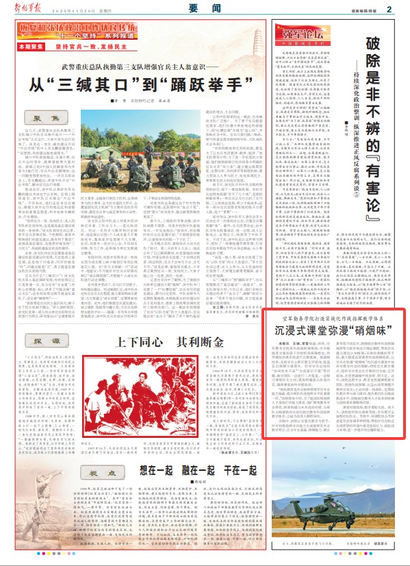 實踐中,該院以實案化教學(xué)為抓手,針對初級指揮學(xué)員能力生成規(guī)律及專業(yè)教學(xué)特點,區(qū)分專業(yè)基礎(chǔ)、保障能力、聯(lián)合素養(yǎng)等不同層次,圍繞航空勤務(wù)作戰(zhàn)保障規(guī)律等方面系統(tǒng)設(shè)計理論課程,幫助學(xué)員建立理論認知框架;采取仿真模擬等手段,最大限度還原典型作戰(zhàn)保障場景,讓學(xué)員在彌漫“硝煙味”的沉浸式課堂中加深對教學(xué)內(nèi)容的理解;持續(xù)優(yōu)化教學(xué)模式,組織學(xué)員常態(tài)化開展研討交流、互評質(zhì)詢,在思想碰撞中找差距、明不足。此外,該院還跨專業(yè)、跨系室組建課程教學(xué)團隊,圍繞作戰(zhàn)保障、應(yīng)急應(yīng)戰(zhàn)等課題開展研究攻關(guān);主動對接一線部隊,定期組織教員參與演習(xí)演訓(xùn),提升教員隊伍曉戰(zhàn)教戰(zhàn)水平,助推航空勤務(wù)人才培養(yǎng)供給側(cè)與戰(zhàn)場需求側(cè)精準對接。