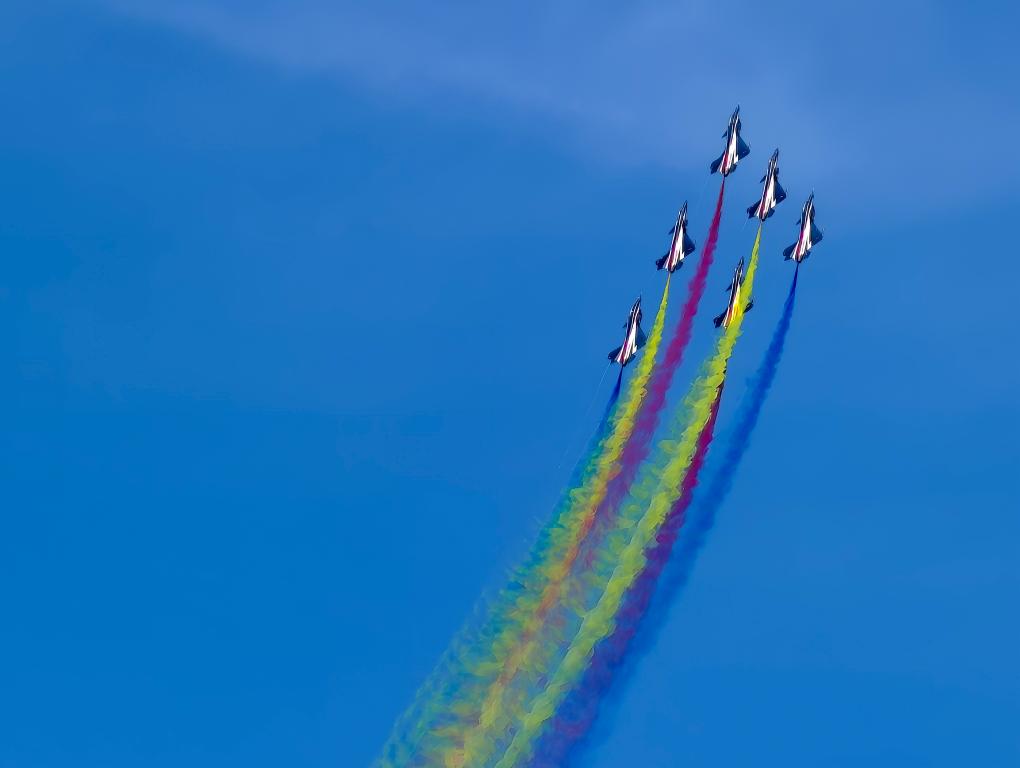 轟鳴聲由遠(yuǎn)及近,空軍八一飛行表演隊(duì)在白云間“畫出”的絢麗“彩旗”,仿佛訴說著:藍(lán)天之上,中國人正在書寫新的傳奇。(記者宋晨)