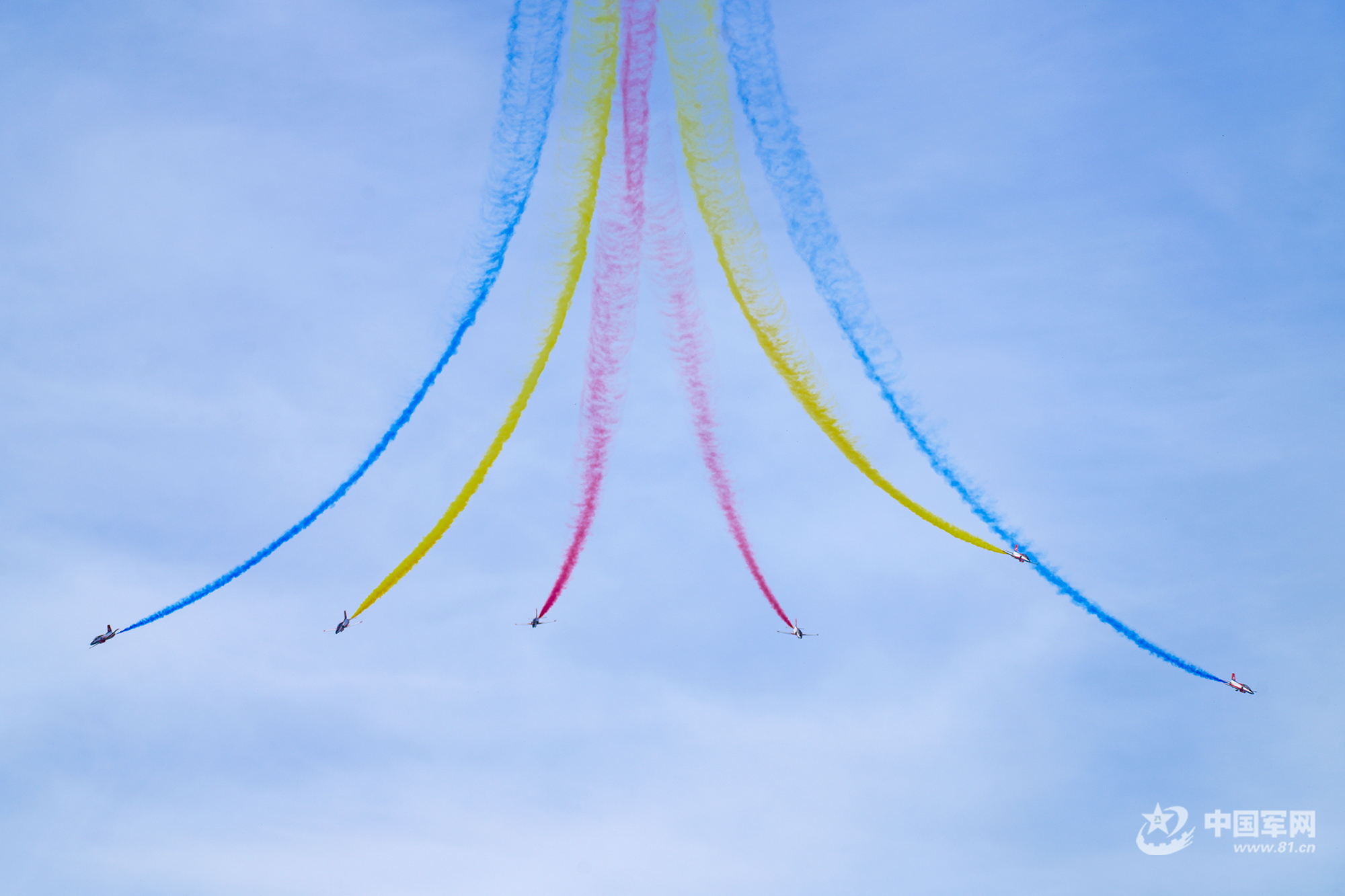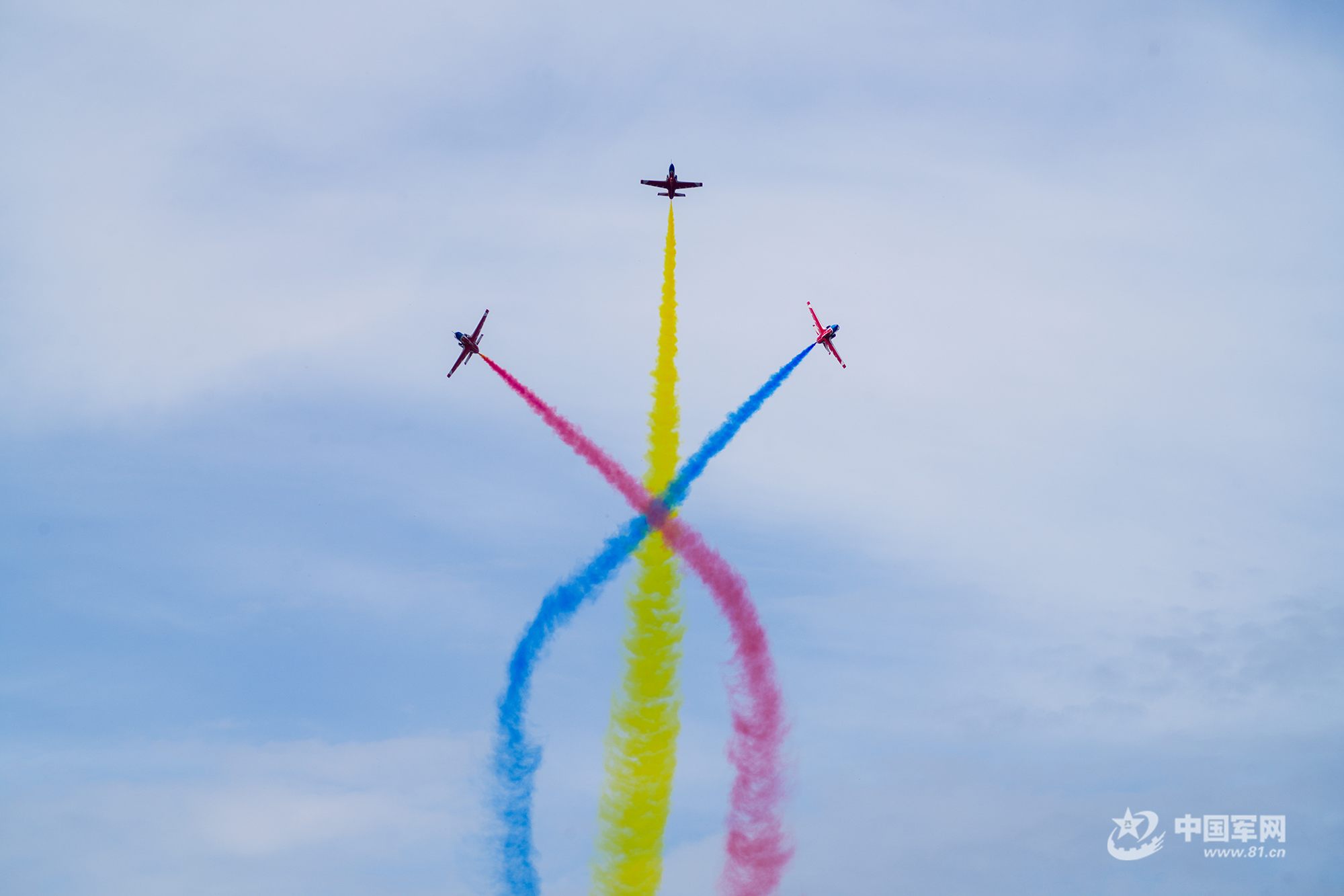 八一飛行表演隊紅黃藍彩煙劃過天際