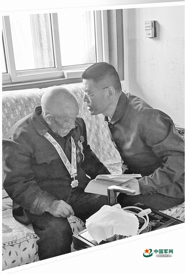93歲的老兵陳崇義去年犯了兩次腦血栓,讓傅中魁非常掛念??吹礁抵锌哌M(jìn)屋里,臥病在床的陳崇義費(fèi)力地坐起身來(lái)。聊一會(huì)兒,老人倚著床頭休息一會(huì)兒;聊到興頭上,身體就往前傾一傾。傅中魁拉著陳崇義的手,把身體貼到老人跟前,不厭其煩地一遍遍聽(tīng)他講戰(zhàn)斗故事。