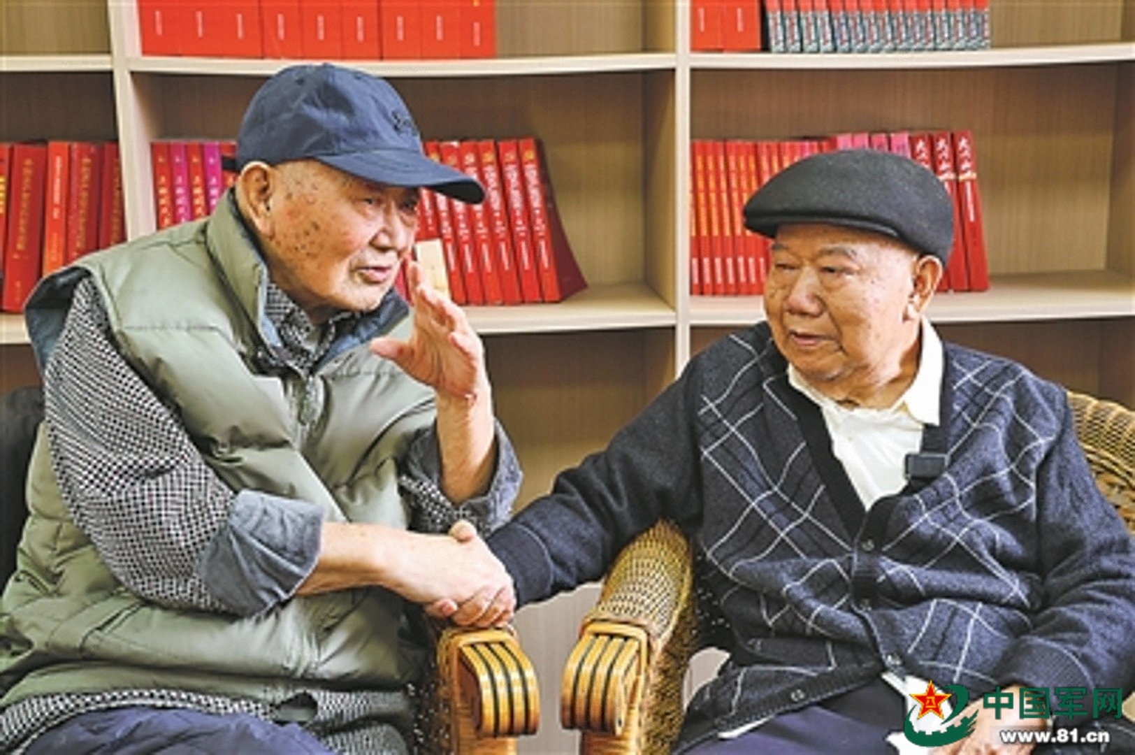 抗美援朝老兵宋英(左)和雷璽(右)共同回憶當(dāng)年的歲月。秦 美攝