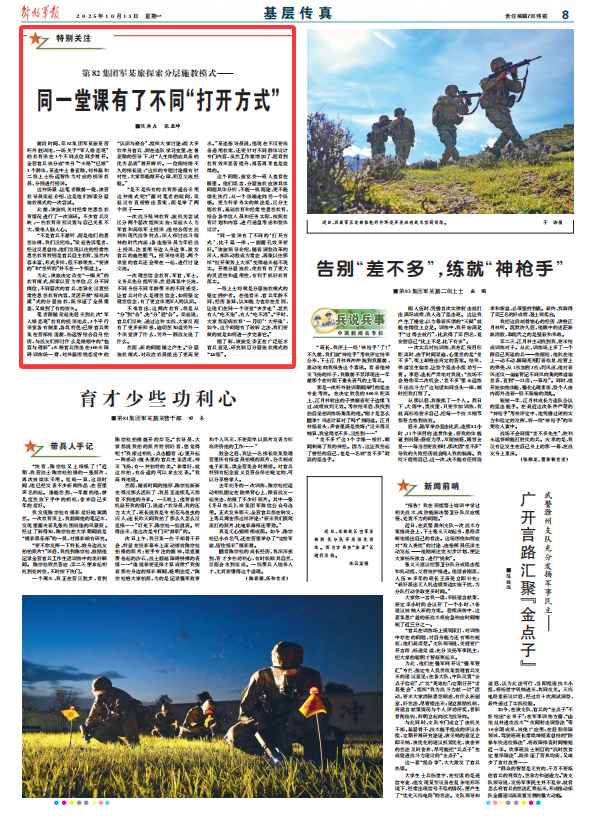 一級上士劉鷺是分層施教模式的堅定擁護者。在他看來,官兵年齡不同、經(jīng)歷各異、認知能力也存在差別,讓他們在同一個課堂“齊步走”,顯然有人“吃不飽”,有人“吃不消”?!捌綍r,大家都詬病教育‘一刀切’‘大呼隆’,如今,這個問題有了破解之法,我們要做的就是如何進一步完善它。”