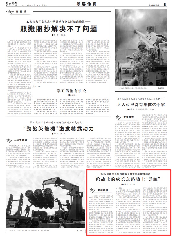 該旅人力資源科科長(zhǎng)對(duì)此感觸頗深:“人才培養(yǎng)不可能一蹴而就,唯有以科學(xué)合理的規(guī)劃為指引,明確成長(zhǎng)路徑、搭建成長(zhǎng)階梯,方能充分激發(fā)人才潛能,讓官兵各展所長(zhǎng)?!?/p>