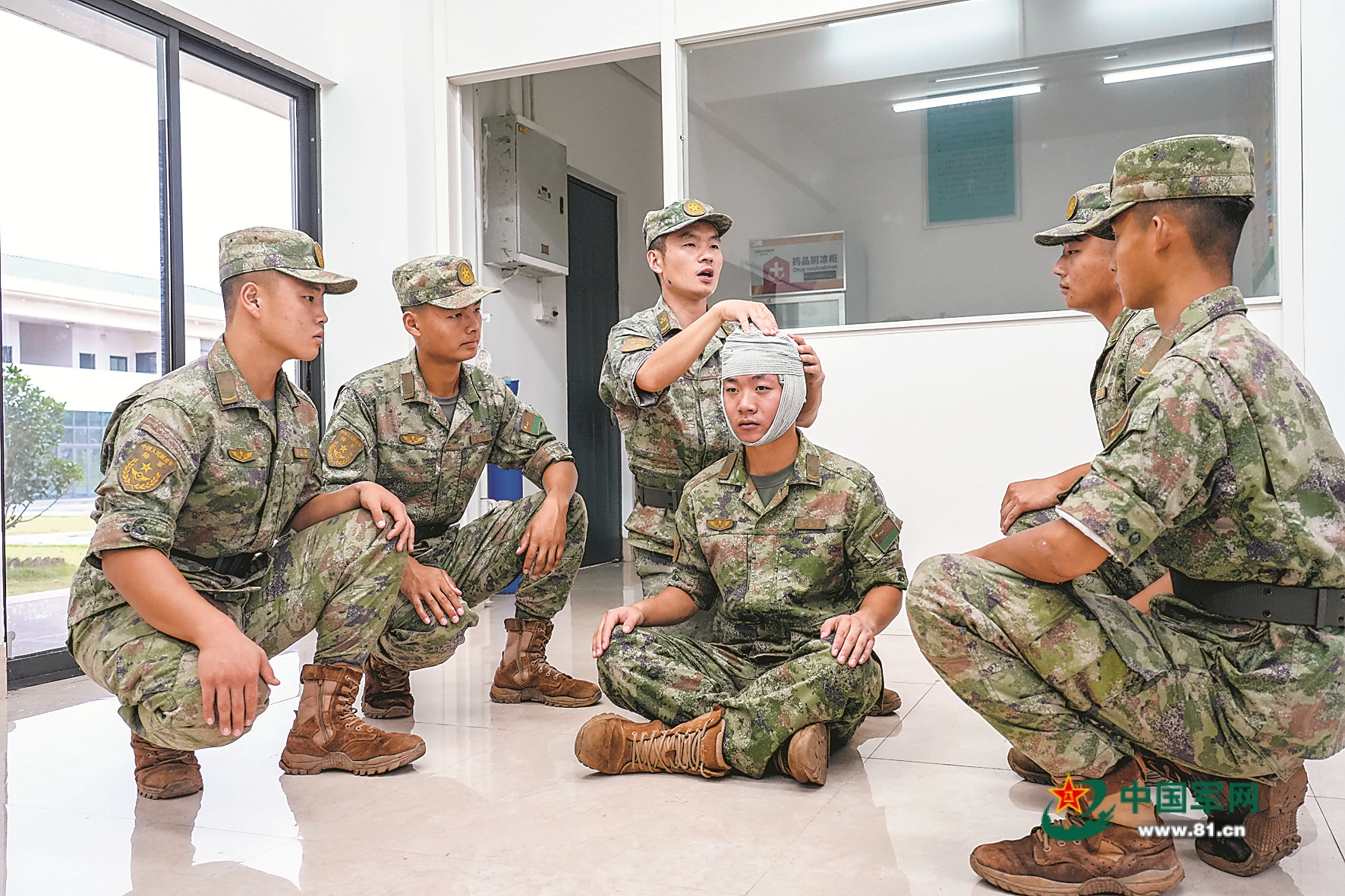 該場站衛(wèi)生連骨干楊杰(左三)為運輸連戰(zhàn)士講解衛(wèi)生與救護要領(lǐng)。 吳延輝攝