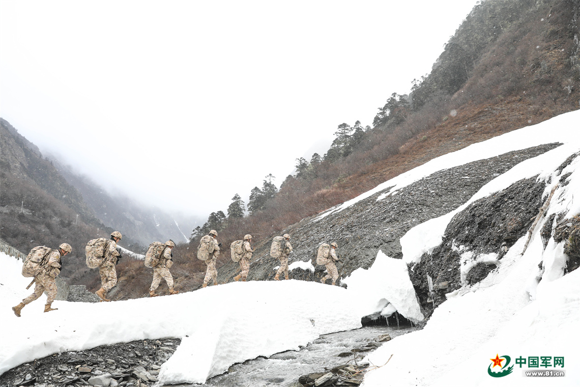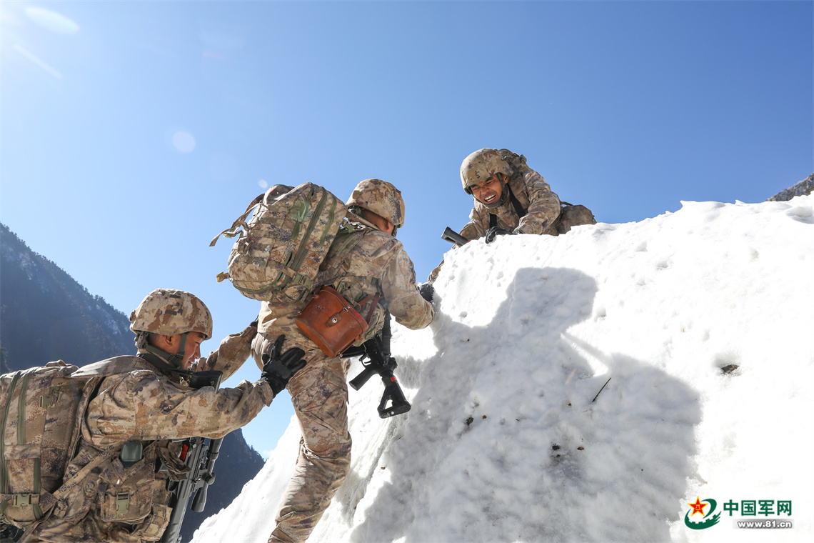 △次羅布(右一)與戰(zhàn)友們互幫互助爬冰臥雪。