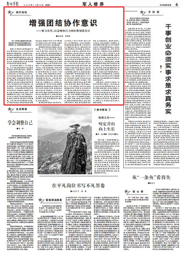 眾力并則萬(wàn)鈞舉,人心齊則泰山移。上下同欲、團(tuán)結(jié)協(xié)作歷來(lái)是我黨我軍的政治優(yōu)勢(shì)和制勝密碼,是凝聚人心、成就偉業(yè)的重要保證。紅軍過(guò)草地時(shí)兇險(xiǎn)莫測(cè),官兵們拉著繩子前行,毛澤東同志幽默地說(shuō):“大家都是一根繩上的‘螞蚱’,我們的力量就要這樣擰成一根繩?!标愒仆靖锌骸凹t軍兵心之團(tuán)結(jié)及士氣之旺,為國(guó)內(nèi)任何軍隊(duì)所不及?!闭且?yàn)槿娚舷聞哿ν?,我軍才能拖不垮、打不散,才能無(wú)堅(jiān)不摧、無(wú)往不勝??梢哉f(shuō),團(tuán)結(jié)協(xié)作是革命前輩們經(jīng)過(guò)生死考驗(yàn)?zāi)Y(jié)而成的優(yōu)良傳統(tǒng),是我們無(wú)懼任何風(fēng)雨、戰(zhàn)勝一切困難挑戰(zhàn)的強(qiáng)大力量。當(dāng)前,實(shí)現(xiàn)建軍一百年奮斗目標(biāo)處于加油加壓的沖刺期,面臨諸多艱巨繁重的任務(wù)與風(fēng)險(xiǎn)挑戰(zhàn)。只有堅(jiān)定不移走好團(tuán)結(jié)奮斗之路,以“功成不必在我、功成必定有我”的境界與擔(dān)當(dāng),既能當(dāng)“紅花”又甘于做“綠葉”,既能打主攻又樂(lè)于當(dāng)助攻,才能打好攻堅(jiān)戰(zhàn)、跑出加速度、建出高質(zhì)量。
