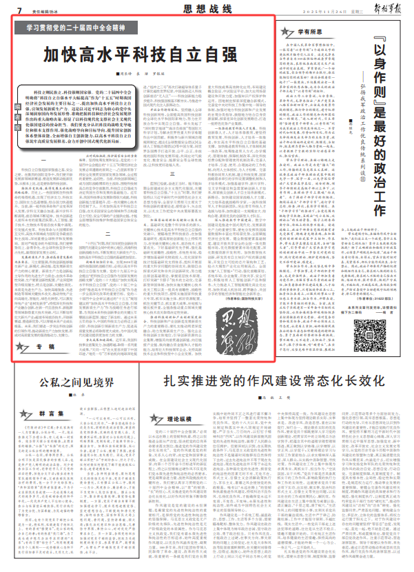 科技立則民族立,科技強(qiáng)則國(guó)家強(qiáng)。黨的二十屆四中全會(huì)明確將“科技自立自強(qiáng)水平大幅提高”作為“十五五”時(shí)期我國(guó)經(jīng)濟(jì)社會(huì)發(fā)展的主要目標(biāo)之一,提出加快高水平科技自立自強(qiáng),引領(lǐng)發(fā)展新質(zhì)生產(chǎn)力。這是以習(xí)近平同志為核心的黨中央深刻洞察國(guó)內(nèi)外發(fā)展形勢(shì)、準(zhǔn)確把握科技和經(jīng)濟(jì)社會(huì)發(fā)展規(guī)律作出的重大戰(zhàn)略決策,彰顯了以科技現(xiàn)代化支撐社會(huì)主義現(xiàn)代化強(qiáng)國(guó)建設(shè)的使命擔(dān)當(dāng)。我們要充分認(rèn)識(shí)科技的戰(zhàn)略先導(dǎo)地位和根本支撐作用,強(qiáng)化戰(zhàn)略導(dǎo)向和目標(biāo)導(dǎo)向,提升國(guó)家創(chuàng)新體系整體效能,全面增強(qiáng)自主創(chuàng)新能力,以高水平科技自立自強(qiáng)筑牢高質(zhì)量發(fā)展根基,奮力開創(chuàng)中國(guó)式現(xiàn)代化新局面。