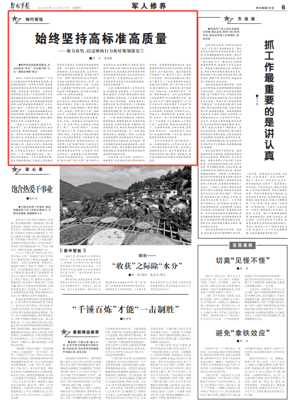 “取法于上,僅得為中;取法于中,故為其下。”古人的智慧啟示我們,標(biāo)準(zhǔn)決定水準(zhǔn),質(zhì)量影響成敗。如期實(shí)現(xiàn)建軍一百年奮斗目標(biāo),高質(zhì)量推進(jìn)國(guó)防和軍隊(duì)現(xiàn)代化,是黨的意志、人民的期盼,是關(guān)系我軍前途命運(yùn)和國(guó)家長(zhǎng)治久安的筑基工程。其意義之重大、影響之深遠(yuǎn),決定了攻堅(jiān)沖刺的建設(shè)標(biāo)準(zhǔn)必須更高、工作要求必須更嚴(yán)、發(fā)展質(zhì)量必須更好。“一釘一鉚牽連將士安危,一槍一彈關(guān)乎戰(zhàn)場(chǎng)勝負(fù)?!敝挥辛⑵鹁媲缶?、追求卓越的高標(biāo)準(zhǔn),才能使工作成果達(dá)到符合實(shí)戰(zhàn)要求、經(jīng)得起實(shí)踐檢驗(yàn)的高質(zhì)量。還應(yīng)看到,當(dāng)今世界新軍事革命浪潮澎湃,我們既在追趕,也在開(kāi)創(chuàng)。始終堅(jiān)持高標(biāo)準(zhǔn)高質(zhì)量,是規(guī)避“技術(shù)代差”、擺脫“路徑依賴”的必然選擇。無(wú)論是從頂層設(shè)計(jì)的“最先一公里”、還是到末端落實(shí)的“最后一公里”,無(wú)論是從“大國(guó)重器”的研發(fā)列裝、還是到“毛細(xì)血管”的數(shù)據(jù)融合,我們都必須錨定世界一流,始終追求極致。