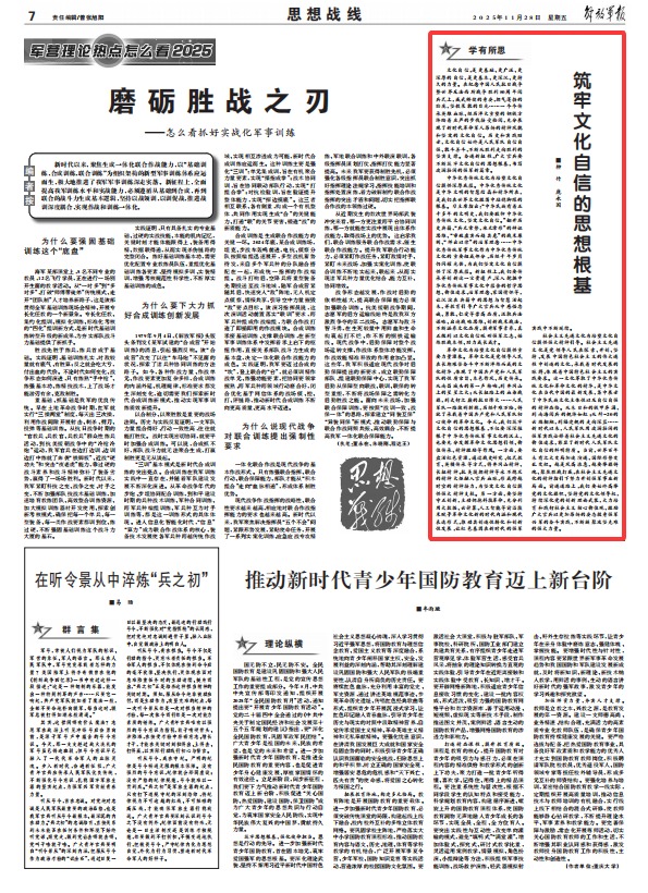 文化自信,是更基礎(chǔ)、更廣泛、更深厚的自信,是更基本、更深沉、更持久的力量。在紀(jì)念中國(guó)人民抗日戰(zhàn)爭(zhēng)暨世界反法西斯戰(zhàn)爭(zhēng)勝利80周年閱兵式上,威武矯健的身姿,朝氣蓬勃的臉龐,堅(jiān)毅果敢的目光……一個(gè)個(gè)傳承英雄血脈、經(jīng)歷淬火重塑的鋼鐵方陣踏著莊嚴(yán)的步伐接受檢閱,充分展現(xiàn)了新時(shí)代革命軍人昂揚(yáng)的精神風(fēng)貌和堅(jiān)定的文化自信。歷史和實(shí)踐昭示,文化自信始終是人民軍隊(duì)自信自強(qiáng)、敢斗善斗,不斷從勝利走向勝利的堅(jiān)實(shí)支撐。奮進(jìn)新征程,廣大官兵要不斷筑牢文化自信的思想根基,書(shū)寫(xiě)波瀾壯闊的強(qiáng)軍新篇章。