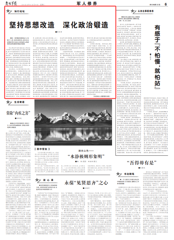 馬克思說,人是靠思想而站立的,也因思想而強大?;仡櫸臆姎v史上的轉折關口、關鍵當口,都以整頓思想打頭,著力正本清源、革弊鼎新,通過思想改造統(tǒng)一思想、凝聚意志。當前,世情、國情、黨情、軍情都在發(fā)生復雜深刻變化,我軍在政治上面臨的考驗錯綜復雜。從客觀情況看,固根與毀根的較量一刻未停,思想不純、政治不忠的“病原體”還沒有徹底清除,“四大考驗”“四種危險”仍然存在,深刻影響著軍隊黨員干部隊伍建設,作風建設仍在路上;從主觀因素講,人的思想和行為會受到“政治微生物”的侵蝕,需要始終具備足夠強的免疫力。對此,必須摒棄一時之舉、疲勞松懈、闖關過關的思想,以一抓到底的韌勁定力,從根子上清,扭住頑疾治,以內(nèi)無妄思保證外無妄動,以更加深入的思想改造帶動政治鍛造再加強。