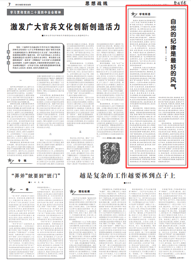 強化思想引領(lǐng)。思想是行動的先導(dǎo),培養(yǎng)自覺的紀(jì)律,首要在于筑牢思想根基。要堅持用黨的創(chuàng)新理論武裝頭腦,堅持不懈用習(xí)近平新時代中國特色社會主義思想凝心鑄魂,深入學(xué)習(xí)貫徹習(xí)近平強軍思想,切實用馬克思主義中國化時代化最新成果統(tǒng)一思想、統(tǒng)一意志、統(tǒng)一行動;傳承人民軍隊紅色基因和優(yōu)良傳統(tǒng),深入開展黨史、軍史學(xué)習(xí)教育,講好邱少云、冰雕連等英模遵紀(jì)守紀(jì)的感人故事,使官兵更加深刻理解“加強紀(jì)律性,革命無不勝”的勝戰(zhàn)邏輯,讓守紀(jì)如鐵的紅色基因煥發(fā)出強大生命力;持之以恒強化紀(jì)律教育,建立常態(tài)化長效化的紀(jì)律教育機制,使紀(jì)律教育貫穿官兵成長全周期、融入組織管理全過程,營造崇尚紀(jì)律、敬畏紀(jì)律、遵守紀(jì)律、維護紀(jì)律的濃厚氛圍。