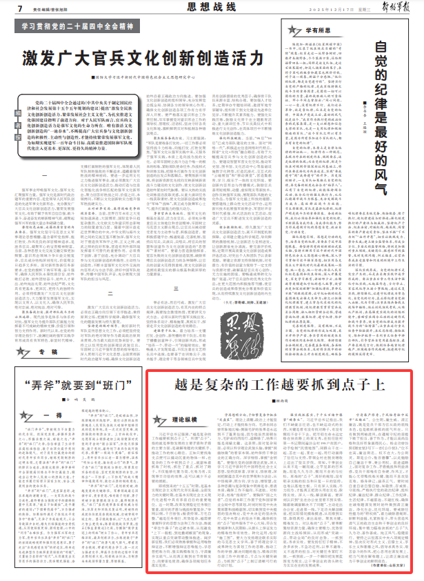 學(xué)思想明方向,于紛繁復(fù)雜中把準(zhǔn)“定盤星”。理論上清醒,政治上才能堅(jiān)定,行動(dòng)上才能找準(zhǔn)方向。毛澤東同志曾形象地比喻:倒騎毛驢的張果老永遠(yuǎn)到不了蓬萊仙境,因?yàn)樗m然面朝東方,毛驢卻向西而行,道路錯(cuò)了,結(jié)果只能是南轅北轍。這表明,面對(duì)復(fù)雜局面,必須以科學(xué)理論武裝頭腦,掌握“洞幽燭微”的看家本領(lǐng),始終保持干事創(chuàng)業(yè)的正確方向。深學(xué)細(xì)悟,掌握“金鑰匙”。要強(qiáng)化黨的創(chuàng)新理論武裝,深入學(xué)習(xí)習(xí)近平新時(shí)代中國(guó)特色社會(huì)主義思想,堅(jiān)持讀原著、學(xué)原文、悟原理,深刻把握蘊(yùn)含其中的世界觀和方法論,從中悟規(guī)律、明方向、學(xué)方法、增智慧,在各種思潮與復(fù)雜現(xiàn)象中明辨是非、看清本質(zhì),確保工作不偏向、不迷航。對(duì)標(biāo)對(duì)表,校準(zhǔn)“指南針”。要胸懷“國(guó)之大者”,自覺(jué)將本職工作置于黨和國(guó)家事業(yè)全局中思考謀劃,時(shí)刻對(duì)標(biāo)黨中央決策部署和戰(zhàn)略意圖,切實(shí)做到黨中央提倡的堅(jiān)決響應(yīng),黨中央決定的堅(jiān)決執(zhí)行,黨中央禁止的堅(jiān)決不做,確保抓住的“點(diǎn)子”始終服務(wù)于中心大局,符合發(fā)展規(guī)律和人民期盼,從源頭上保證發(fā)力的精準(zhǔn)性和有效性。轉(zhuǎn)化運(yùn)用,繪好“施工圖”。要大力發(fā)揚(yáng)理論聯(lián)系實(shí)際的馬克思主義學(xué)風(fēng),善于將理論學(xué)習(xí)成果轉(zhuǎn)化為謀劃工作的思路、推動(dòng)工作的舉措、解決問(wèn)題的能力,精準(zhǔn)識(shí)別當(dāng)前工作中的堵點(diǎn)、卡點(diǎn)與關(guān)鍵突破點(diǎn),為抓到“點(diǎn)子”上制訂清晰可行的行動(dòng)計(jì)劃。