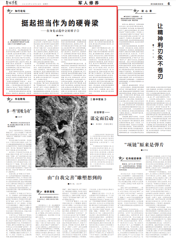 習主席強調(diào):“擔當和作為是一體的,不作為就是不擔當,有作為就要有擔當。做事總是有風險的。正因為有風險,才需要擔當。”站在攻堅建軍百年的關鍵當口,黨員干部特別是領導干部要拎著“烏紗帽”干事盡責,面對風險不退縮,勇?lián)氊煵煌普?,?jīng)受考驗不慌張,凝聚全力攻堅建軍百年、矢志奮進強軍一流的奮斗意志。
