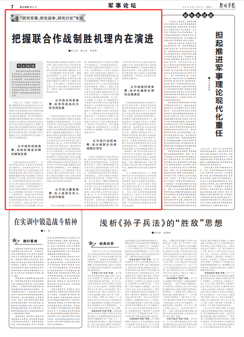 總之,隨著信息技術、人工智能等新興技術的發(fā)展及其在軍事領域的廣泛應用,聯合作戰(zhàn)形態(tài)正在發(fā)生持續(xù)演變,聯合作戰(zhàn)制勝機理也隨之發(fā)生深刻變革。這不僅重塑了傳統(tǒng)的作戰(zhàn)理念和作戰(zhàn)方式,也對未來聯合作戰(zhàn)能力建設提出了新的更高要求。對此,我們必須保持戰(zhàn)略清醒和創(chuàng)新活力,密切關注世界軍事發(fā)展趨勢,深入研究聯合作戰(zhàn)制勝機理,不斷推動聯合作戰(zhàn)理論和實踐創(chuàng)新,為打贏信息化智能化戰(zhàn)爭奠定堅實基礎。
