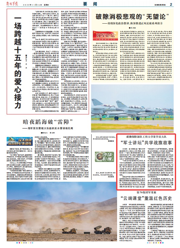 “我所在單位前身部隊誕生于抗戰(zhàn)時期,組建一年便參加百團大戰(zhàn),被授予‘勢如破竹十九團’榮譽戰(zhàn)旗……”學(xué)員劉金睿接到授課任務(wù)后,多次聯(lián)系單位教育骨干收集整理戰(zhàn)友們的強軍故事,確保授課內(nèi)容鮮活生動、見人見事?!皠嚅L所在部隊的戰(zhàn)友們不愧是英雄傳人,他們在訓(xùn)練場上奮勇拼搏,取得亮眼成績,是我們學(xué)習(xí)的榜樣?!笔谡n結(jié)束后,一名學(xué)員告訴筆者,他將把劉金睿分享的英雄故事和組訓(xùn)經(jīng)驗帶回連隊,與戰(zhàn)友們共同學(xué)習(xí)。