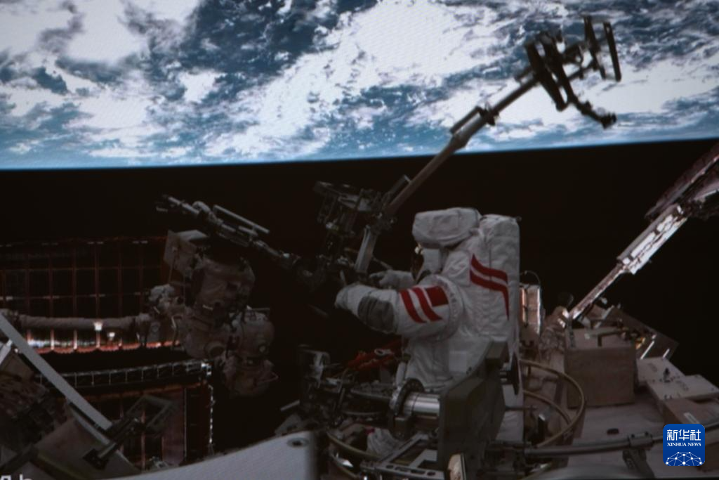 這是12月9日在北京航天飛行控制中心屏幕上拍攝的神舟二十一號(hào)乘組航天員張陸與武飛(右)在艙外工作的畫面。