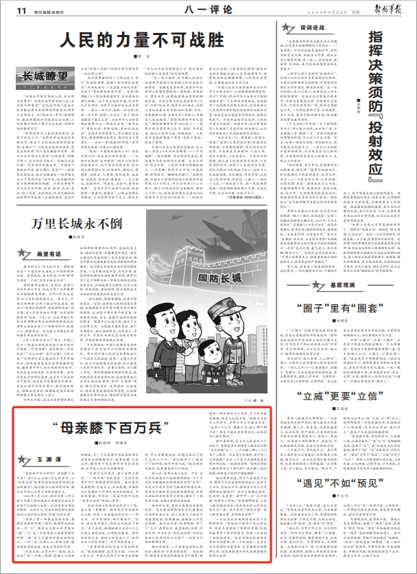 一位記者采訪英雄母親后寫下這樣的詩句:“您的乳汁凝結了戰(zhàn)士的血肉,您的大愛塑造了英雄的靈魂;您的奉獻孕育了勝利的果實,您的一生感動了奮進的后代?!边@是寫給抗戰(zhàn)英雄母親的不朽贊歌,是一個民族和一支軍隊永不枯竭的力量源泉,是穿越時空的精神火炬,永遠照耀著中華民族強國強軍的偉大征程。