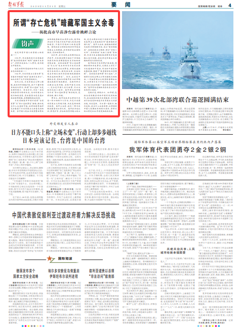 日本首相高市早苗日前將“臺(tái)灣有事”與“存亡危機(jī)事態(tài)”掛鉤,暗示武力介入臺(tái)海的可能,這樣的露骨挑釁完全暴露了日本軍國主義余毒未消的本質(zhì)。在中國人民抗日戰(zhàn)爭暨世界反法西斯戰(zhàn)爭勝利80周年之際,高市的涉臺(tái)狂言不能不引發(fā)中國人民的公憤和譴責(zé),不能不引起世人的高度警惕。國際社會(huì)必須堅(jiān)決阻擊任何復(fù)活軍國主義的圖謀,共同維護(hù)戰(zhàn)后國際秩序,守護(hù)世界和平。