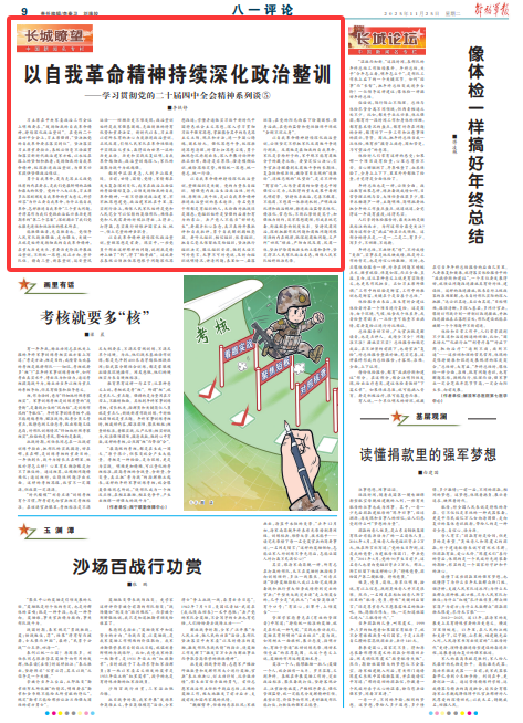 習(xí)主席在中央軍委政治工作會議上明確要求,“發(fā)揚徹底的自我革命精神,持續(xù)深化政治整訓(xùn)”。在黨的二十屆四中全會上,習(xí)主席強(qiáng)調(diào),“堅決把黨的自我革命要求落實到位”。堅決落實習(xí)主席重要指示,各級必須毫不動搖貫徹落實新時代政治建軍方略,以永遠(yuǎn)在路上的堅韌和執(zhí)著,發(fā)揚徹底的自我革命精神,縱深推進(jìn)政治整訓(xùn),為強(qiáng)軍興軍提供堅強(qiáng)政治保證。