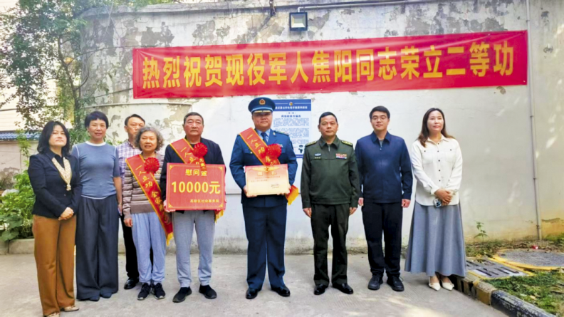 “咚咚鏘,咚咚鏘……”前不久,樊城區(qū)紫貞街道長虹盛景小區(qū)鑼鼓喧天、熱鬧非凡,軍地工作人員聯(lián)合將二等功喜報及慰問金送到現(xiàn)役軍人焦陽的家中,胸戴大紅花、身披紅綬帶的焦陽家人臉上洋溢著喜悅和自豪。