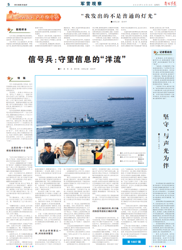 在跟這群信號兵接觸的過程中,記者逐漸認(rèn)識了這個群體。他們是現(xiàn)代海戰(zhàn)中低調(diào)卻關(guān)鍵的戰(zhàn)斗崗位。他們的存在,確保了艦艇在任何情況下都“看得見、聯(lián)得上、說得通”,是艦上指揮系統(tǒng)不可或缺的延伸。伴隨著海軍艦艇駛向深藍(lán),信號兵的作用也愈發(fā)突出。他們不僅成為中外海軍交流的橋梁,更在遠(yuǎn)海大洋擦亮了中國海軍的名片。