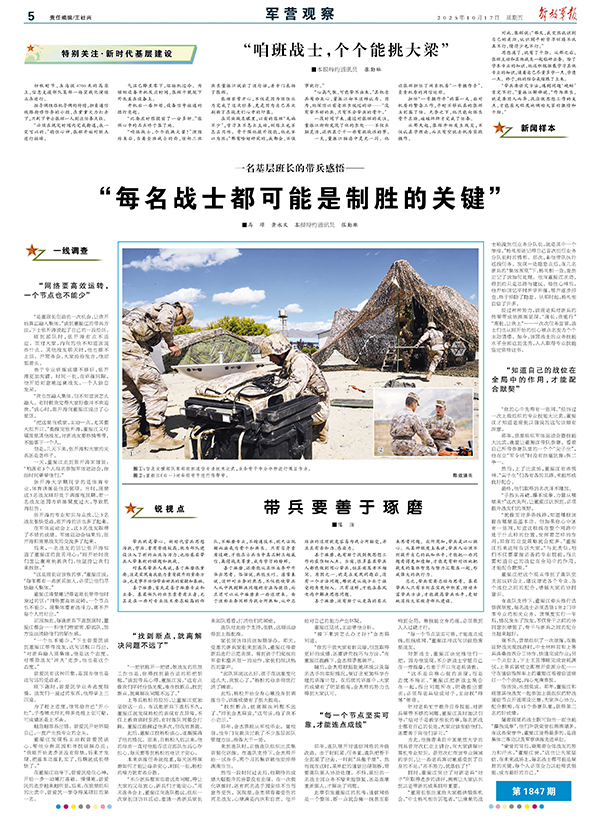 對基層帶兵人來說,善于琢磨很重要,這是實(shí)現(xiàn)自我能力素質(zhì)提升的重要方法,也是事半功倍帶出好兵的前提和基礎(chǔ)。