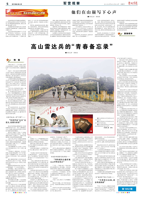 紙頁翻飛,記者還從字里行間讀到了衛(wèi)生員湯嘉庚擔(dān)任廣播員的成長故事,觸摸到了標(biāo)記員付忠彪提干成功后的喜悅,發(fā)現(xiàn)了操縱班長莫輝提高訓(xùn)練效益的“妙招”,與老兵范吉鵬有了“人生不能沒有目標(biāo)和理想,生活不能沒有激情和奮斗”的共鳴……